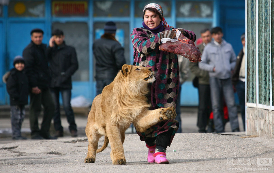 2011年1月20日,塔吉克共和国首都杜尚别,一名动物园工作人员带着狮子在园区内散步。