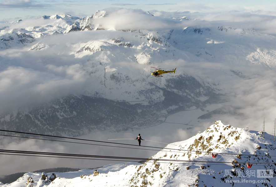 2011年1月29日,瑞士摩根索莫里兹山地景区附近的科尔瓦奇峰,瑞士杂技表演者弗雷迪-诺克在高空缆车绳子上完 ...