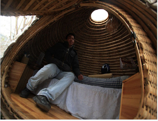 “蛋形蜗居”小屋的设计建造居住者是24岁的北漂小伙戴海飞,他说这个小屋创意来自于年初公司展会上的一个“城市下的蛋”设计项目。随后,小戴借了6000多块钱,在学弟学妹帮助下,花了一两个月时间造出了这座蛋形小屋。