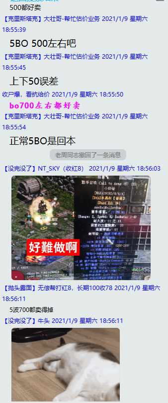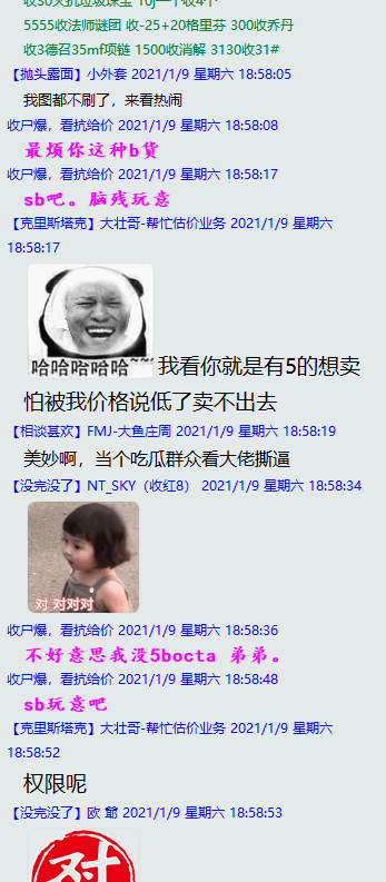 因为看不到全程记录 让他截全程聊天记录图 都始终不敢截全图 这些图 还是群里的其中一个战网战友 私聊发给我的 队员老古 只是觉得这些人估价 价格不对头 就说了句憨憨 然后被斑竹骂傻子 然后把队员老古给踢了 这我没话说 但是身为版主也是骂人方的当事人 却没任何事情