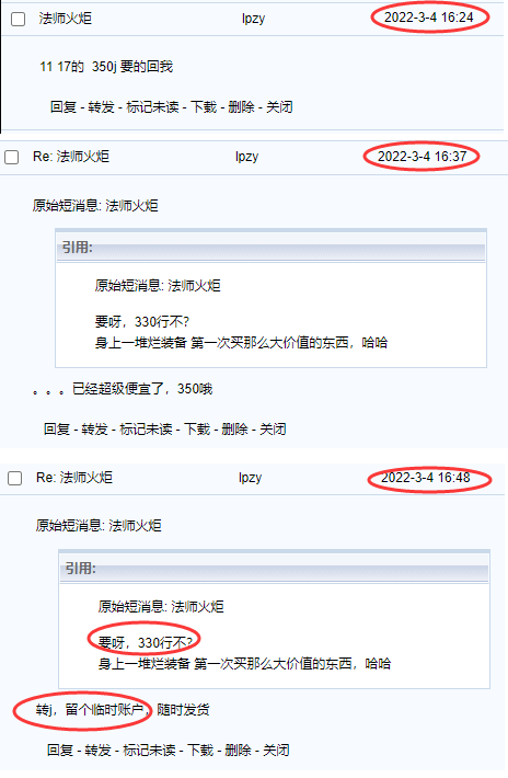 这里是正常短信来往,350j 砍价到330,也没砍多离谱,我是个新人,没玩多久,想着能省一点是一点。
