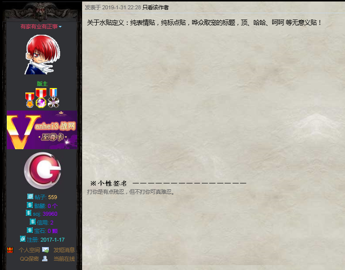 单就发帖本身来说,我不知道还有没有其他恩怨在。楼主的东西确实无意义,版主减信用还有就是因为楼主的帖子大宝剑,让开让开。