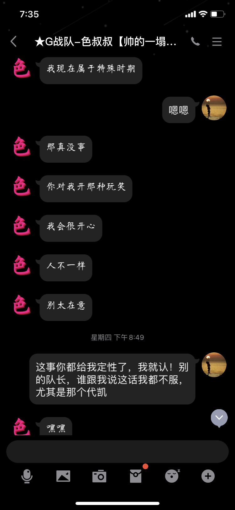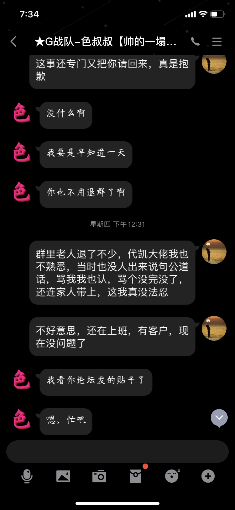 5号中午,G队创始人色叔叔加我qq好友,表明他对此事的态度,对我表示安慰,我同意将前贴沉底,不想因为一个狗杂种影响别人辛辛苦苦创立的G队。同时单飞狗逼已擅自将我从G队清理!论坛以及G队并未就此事做出任何处理。