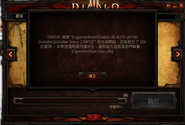 ERROR:档案“..\Diablo-III-8370-zhTW-Installer\Installer Tome 2.MPQE.part”无法被开启,因为发生了108的错误:如果这个问题继续存在,请与智凡迪客服部门联系。(OPENArchive::Execute)