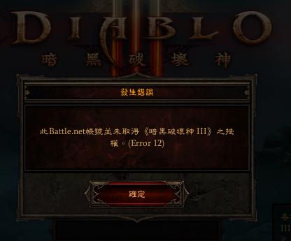 此Battle.net账号并未取得《暗黑破坏神III》之授权。(Error 12)