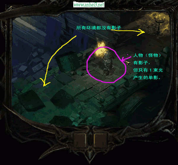 回复: 不错,那些可破坏的环境是没有影子,因为玩家不会留意到这些影子(你以前注意到了吗?).但我没有细问过设计组 | | 个人认为单影子的效果应该是可以调整的,游戏默认的应该是没有石头,灯台等环境的影子. 至于多重影子的特效,感觉没必要,暗黑3也多半不会采用.