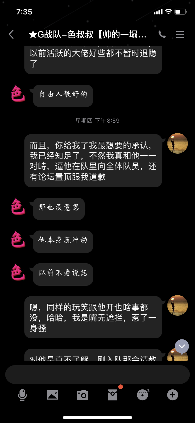 5号中午,G队创始人色叔叔加我qq好友,表明他对此事的态度,对我表示安慰,我同意将前贴沉底,不想因为一个狗杂种影响别人辛辛苦苦创立的G队。同时单飞狗逼已擅自将我从G队清理!论坛以及G队并未就此事做出任何处理。