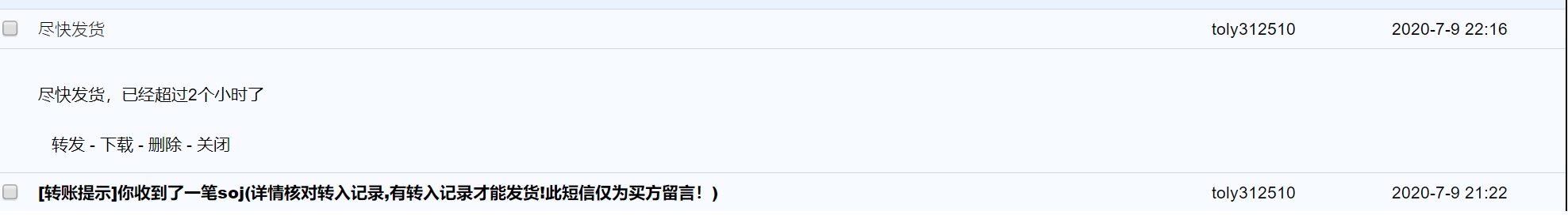 买家付款当日我因外出有事不能及时发货,当天论坛回复买家,隔天早上发货,并于今天早上发货完成并站内短信提醒买家。