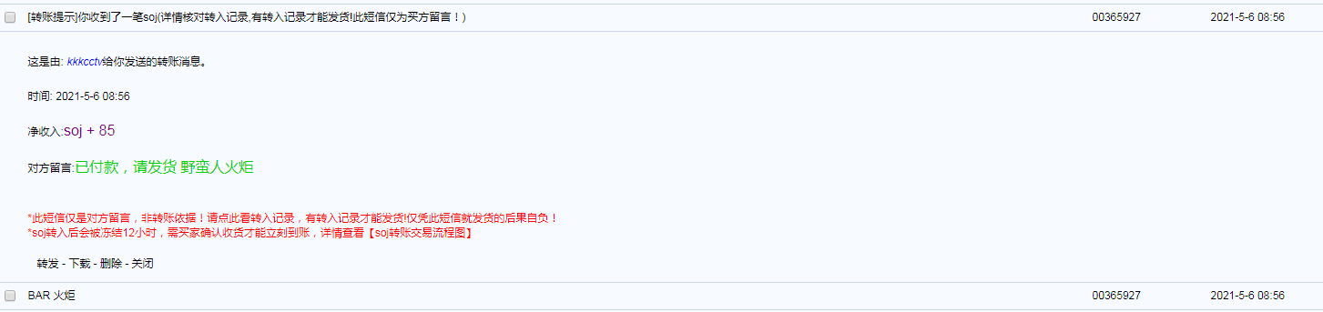 相应处理/处罚:如果买家事先未联系卖家就转账,买家在投诉前必须先用论坛短信联系卖家,标题可以是请及时交易或返回SOJ之类。短信发出的8小时内没收到回复才能在本帖申请返回SOJ(将联系卖家的短信裁图后发在回复里)。申请后SOJ会先冻结2天,2天后才能正式申请返回。