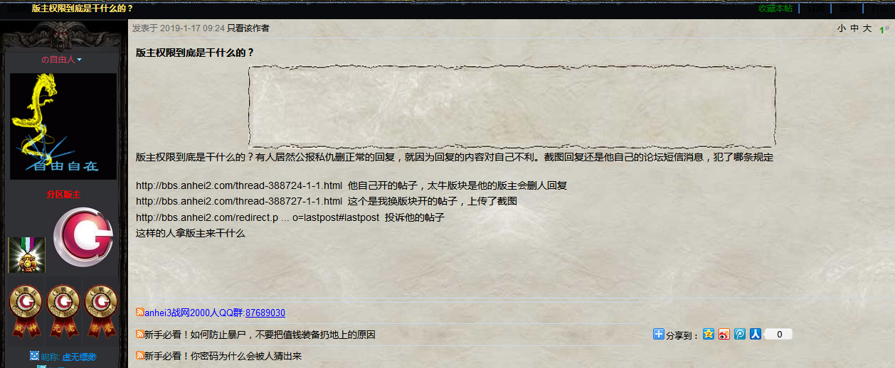 3、版主应该履行版主的职责,而不是乱用权力欺压别的玩家。对于新人,能帮则帮之,对有老玩家,应当尽力留住,如此,粪网人气才能旺盛。而自由人,贵为18专区版主,群不敢进,论坛惹争议,有何脸面坐版主之位?