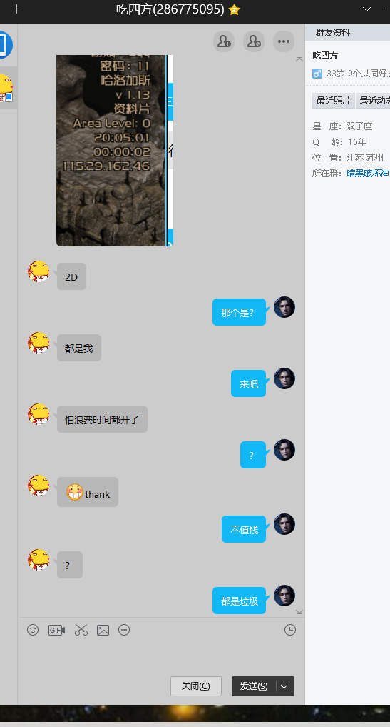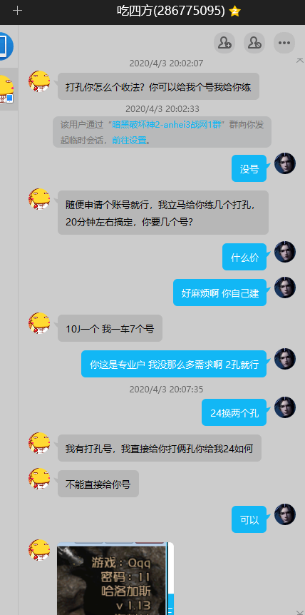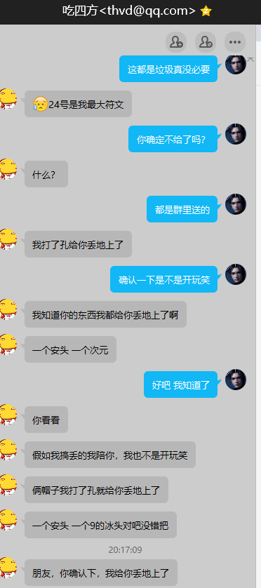 事情简介:事先我收打孔,这个人一直m我让我把账号密码发他,他帮我练打孔小号,我进房间时候是一个人,然后他把另外两个号开进来,我嫌麻烦就把装备扔地让他打孔,他捡了冰头跟安头,他捡完跟拉苏克对话,装作打孔说扔符文吧,我扔个24号给他捡完立即直接三个号全部退出房间,然后戏精上身谎称已经把打孔装备扔地上了。