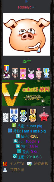 拖鞋组合左护法 | 斩马刀俱乐部荣誉会员 | 非主流build研究院名誉博士 | 倒当三剑客之盲剑客 | 淮山组100%纯棉猫 | 离退休老干部群二当家 | 爆周刊总主编 | 刺桃联盟技术总监 | 水区小转风 | 眼望苍穹胸怀宇宙帅piapia酷dongdong拳打北海幼儿园脚踢南山敬老院瞪谁谁怀孕猫 | 饭团庄庄主 | 风流侠客油中虾 | CoCo-Moon组合经纪人及新闻发言人 | 子非桃焉知桃不二文学社社长