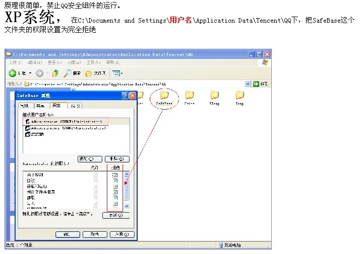 然后C:\Documents and Settings\Administrator\Application Data\Tencent\QQ下的SafeBase文件夹删掉,新建TXT文档,名字改为SafeBase (注意去掉txt扩展名,最好大小写一致)