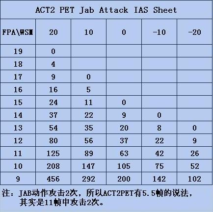 按我理解,上面帖子里的表列出的是a2pet的Jab攻速,虽然没错,但会误导玩家忽视普通攻击的档位。所以建议把普通攻击的档次也加上去。