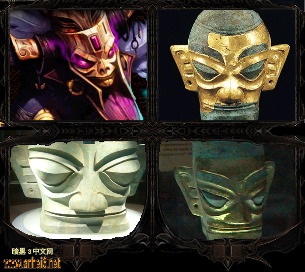 三星堆面具具有非常鲜明的特点,与黄河流域(中原)出土的面具截然不同,现在对比下暗黑3的巫医原型所画的面具与三星堆面具,可以发现2者间非常象,要是设计师的灵感真的来自前几年很火的三星堆,那也算得上融入了中国文化 haha.png (542.07 KB) 2009-5-8 01:30