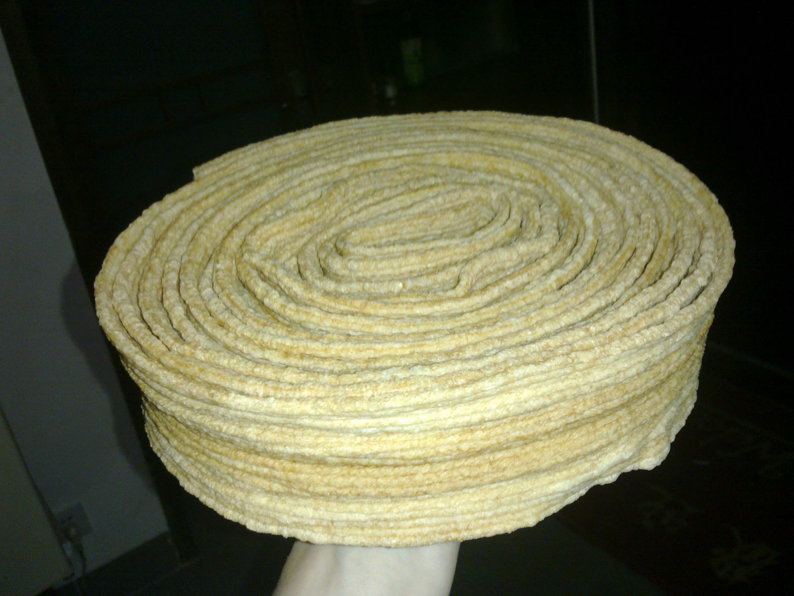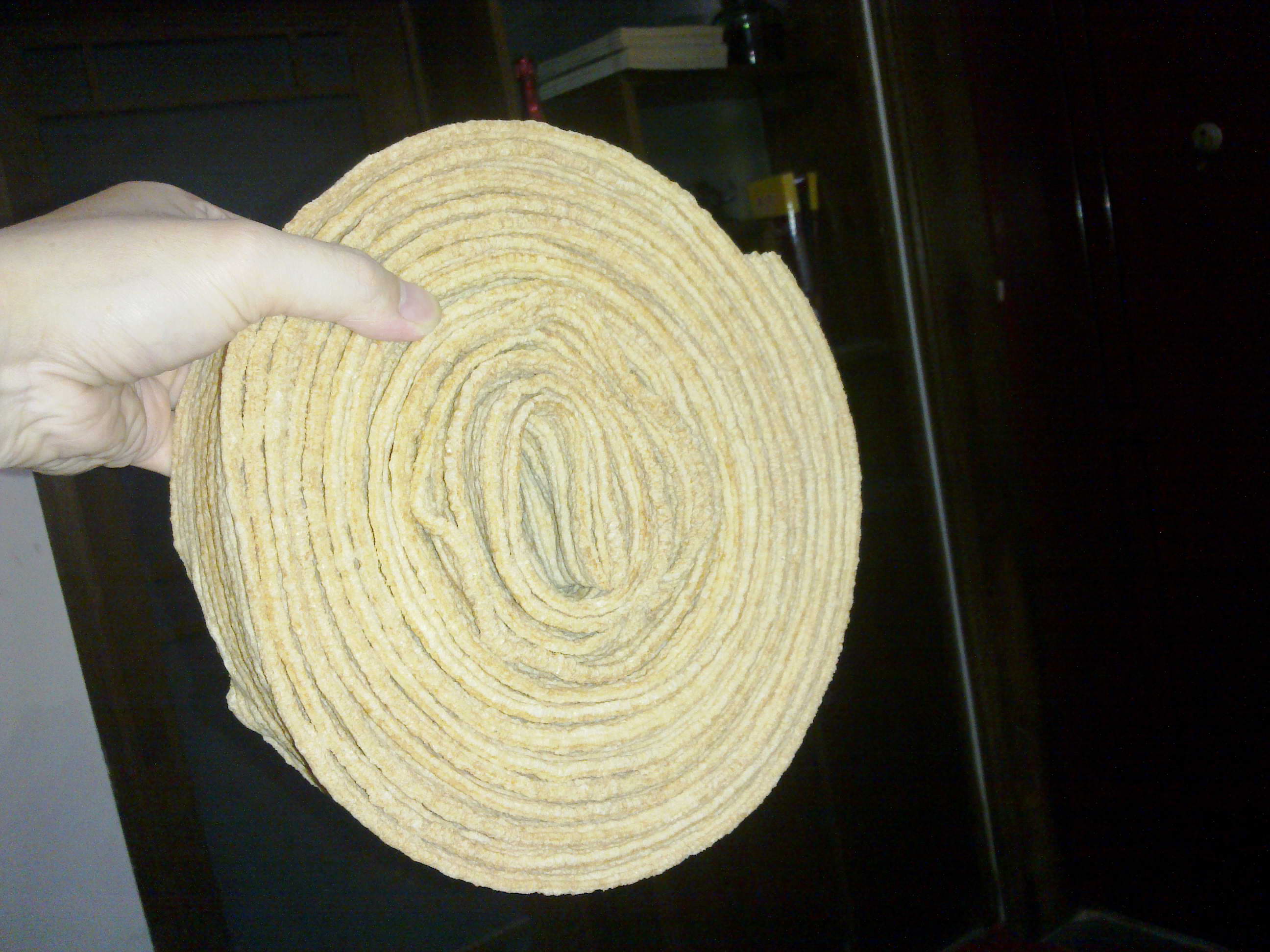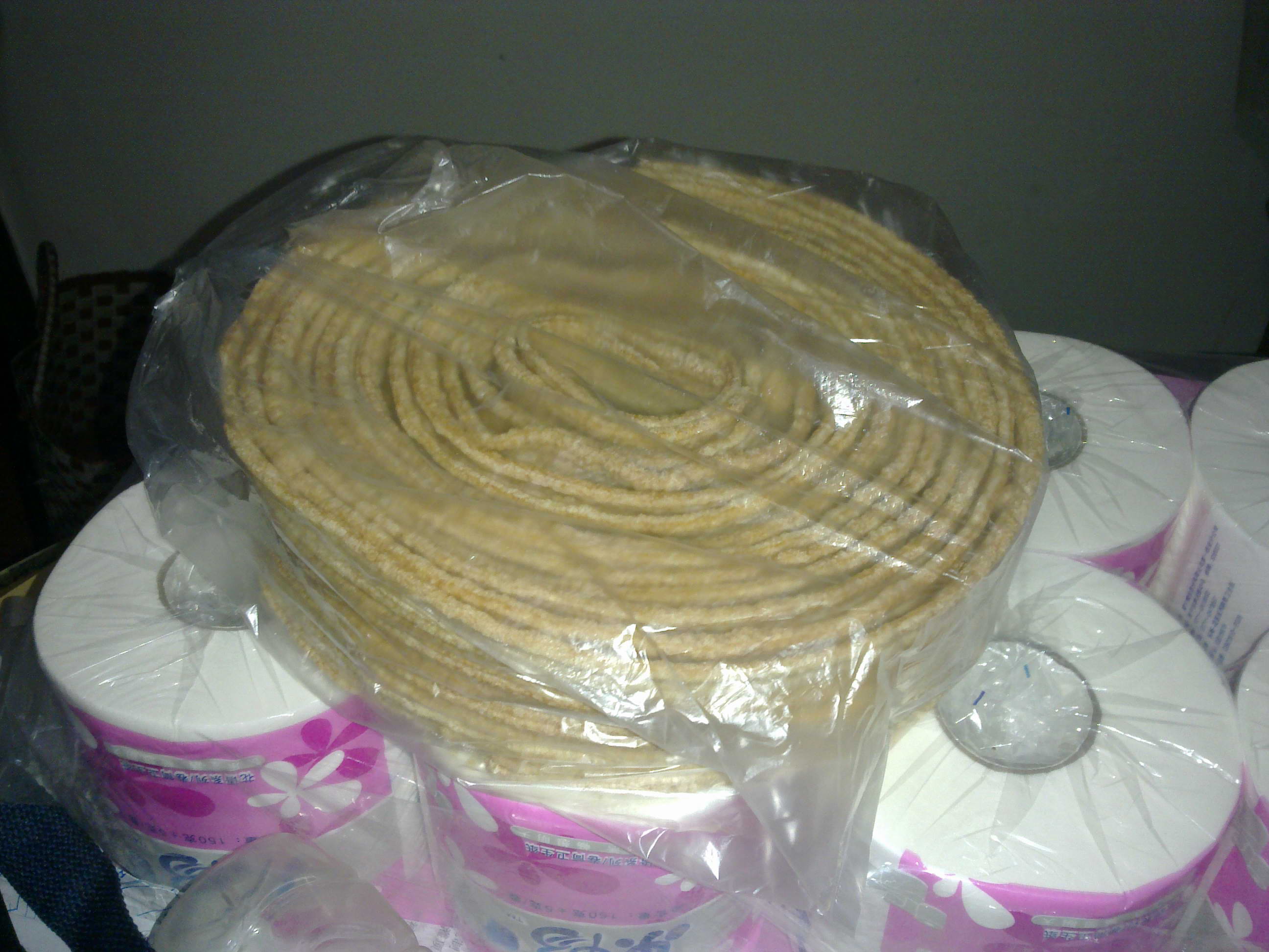 不知原料是玉米还是什么东西,只见她一边拉出来一边卷,后来就变成这样一团了。
