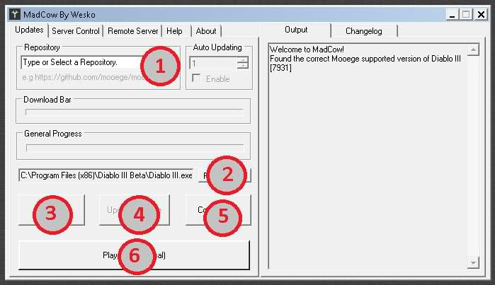红圈4:  点选"Update Mooege" 更新最新版的 Mooege,完成后,右边的状态框会出现“You have latest [mooege] revision : ea58f5a” 字样