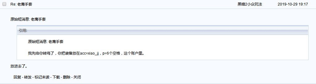 事情经过:10月26日在1.13区买了个眼睛样式99LV的消解板子花了1400鸡,让ID为“harpower”这个玩家放在了我的临时账号里(acc=xiao_jj,p=6个空格),这个玩家确实放了进去,我之后确认过;10月29日晚上与ID为“暗黑2小众玩法”这个玩家交易了老鹰手套(GM13500那个),这个玩家也确实放了进去,当天晚上我回到宾馆确认了。10月30日我记得登录过一次,但是由于在外地旅游,没有及时更改密码,等到10月31日中午再登录时,发现99LV消解板子和88LV三级品(满LL、物免、法术)长串腰带(账号里原有的)不见了,老鹰手套和其他物品均在。下面附有交易记录,本人郑重承诺,如果以上有半句谎言,愿遭天打雷劈!