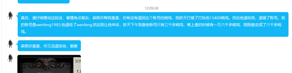 3.取消交易的理由:我昨天打错了打给他13400烧鸡。然后他退给我,退错了账号。我的账号是wenfeng1983,他退给了wenfeng.然后我让他申诉,昨天下午粪总已经退给他了,但是他不承认。