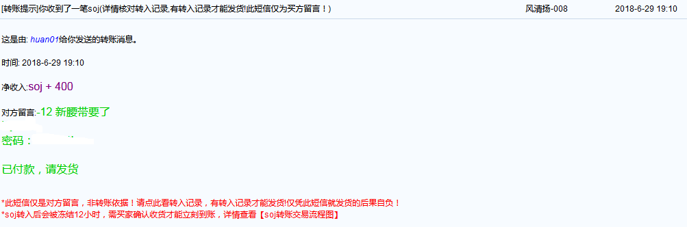 买新腰带,支付400 SOJ  交易时间为:6月29号19点10分