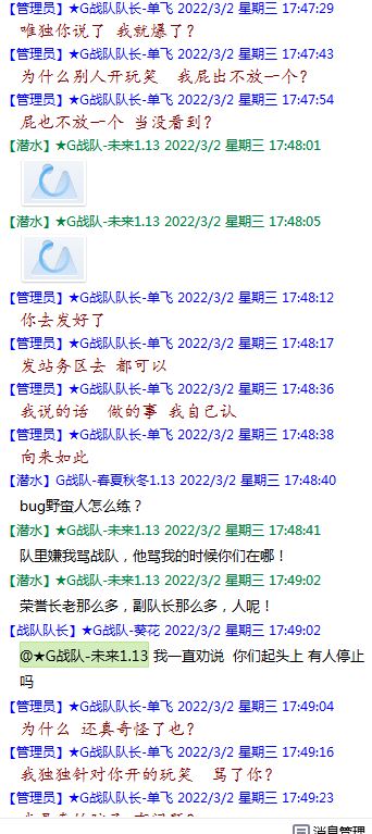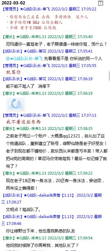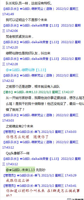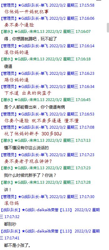 今天下午上班时,偶然看了眼手机,G战队群单飞@所有人发布了一条消息,大意就是他因为工作暂时离开群里,不再玩游戏,我看到群消息也凑了下热闹,调侃了一下单飞,队友挽留他忙工作可以晚上玩游戏,我说他忙着找对象,生猴子,这样的玩笑话是个人我想都知道是在开玩笑,结果引来单飞污言秽语,问候我家人的恶毒辱骂,并且持续到晚上6点半,一开始我还是蒙圈状态,开个玩笑不至于吧,我说话不好听,他开不起玩笑我挨骂是我活该,问候家人就不对了吧?开始我还是忍耐的,毕竟我错在先,先调侃了他。后来他污言秽语不断我才开始跟他对骂,也慢慢明白点他为什么要骂我:单飞说我曾经坑一个网名叫多情游侠的一个119ed,其他全满属性的卓古拉手套,还说我抱大腿,我都不知道我抱了哪位大佬的大腿了,绿野仙踪?跟我关系特别好的好像只有这一位,其他都是请教或者讨论问题,要么就是帮助我以后的新人。我也至今不明白他说的是什么时候到事情,到底是我弃游的这两年内发生的事,还是3,4年前?那会我进入G队了吗?在游戏里我一直用的都是G战队名字的人物,送新人装备,带新人PASS,KB升级,也做了不少贡献,也曾经因为信任大佬,对虚拟资产不是很在意,在请教大佬搭配人物装备后密码都不改,丢过身上最贵的装备气的差点弃游,我没捐过款,没交过队费,之前玩的时候我太穷,想要的装备都买不起,直到20年3月退游日子也过的紧巴巴的,但是从来没做过对不起队里的事情,也没有坑过新人。论坛里最初账号是qq12321,大概是19年3月份注册的账号,同年大概6月左右自己攒钱买了第一个无限以后重新注册了现在这个账号shmulm,并支持大粪充值100元,再无其他账号!单飞说我四年前坑的,四年前23018年我连粪网都不知道如何去坑?一年后的3月我才加入粪网,又不记得什么时候才加入G队,我如何在18年坑人?被骗的据他说叫多情游侠,本人从来没听说过这个名字,也从来没有任何交集,如果此人还在,麻烦出来确认一下是不是我骗了你!我也请求粪总能查询本人IP地址下除了这两个账号,是否还曾有其他账号!本人愿付出所有库存烧鸡!如果有余钱,多情游侠也能站出来指认是我坑了他,我可以赔偿我所有粪网资产,包括游戏人物里的资产!单飞队长愿出一万烧鸡,1000人民币证明是我坑的,请拿出你的诚意来!