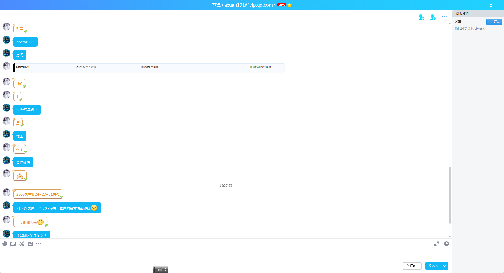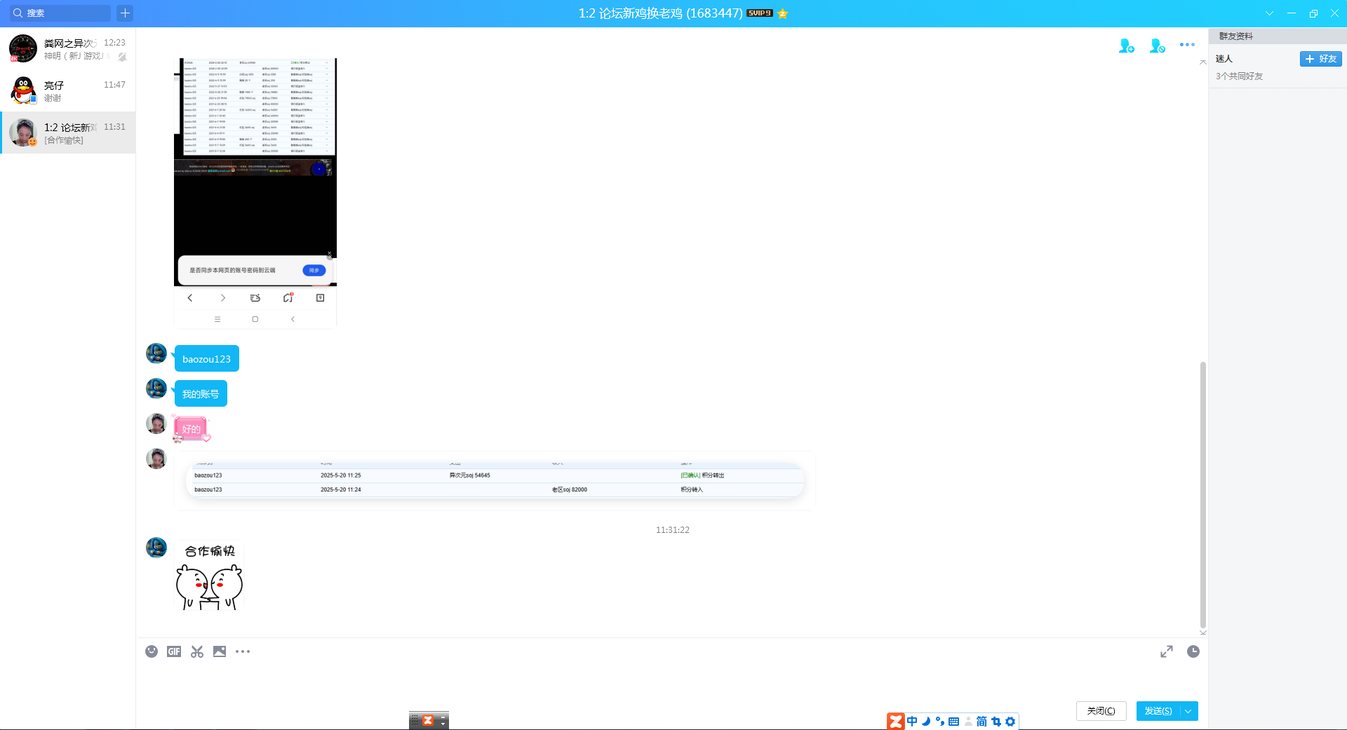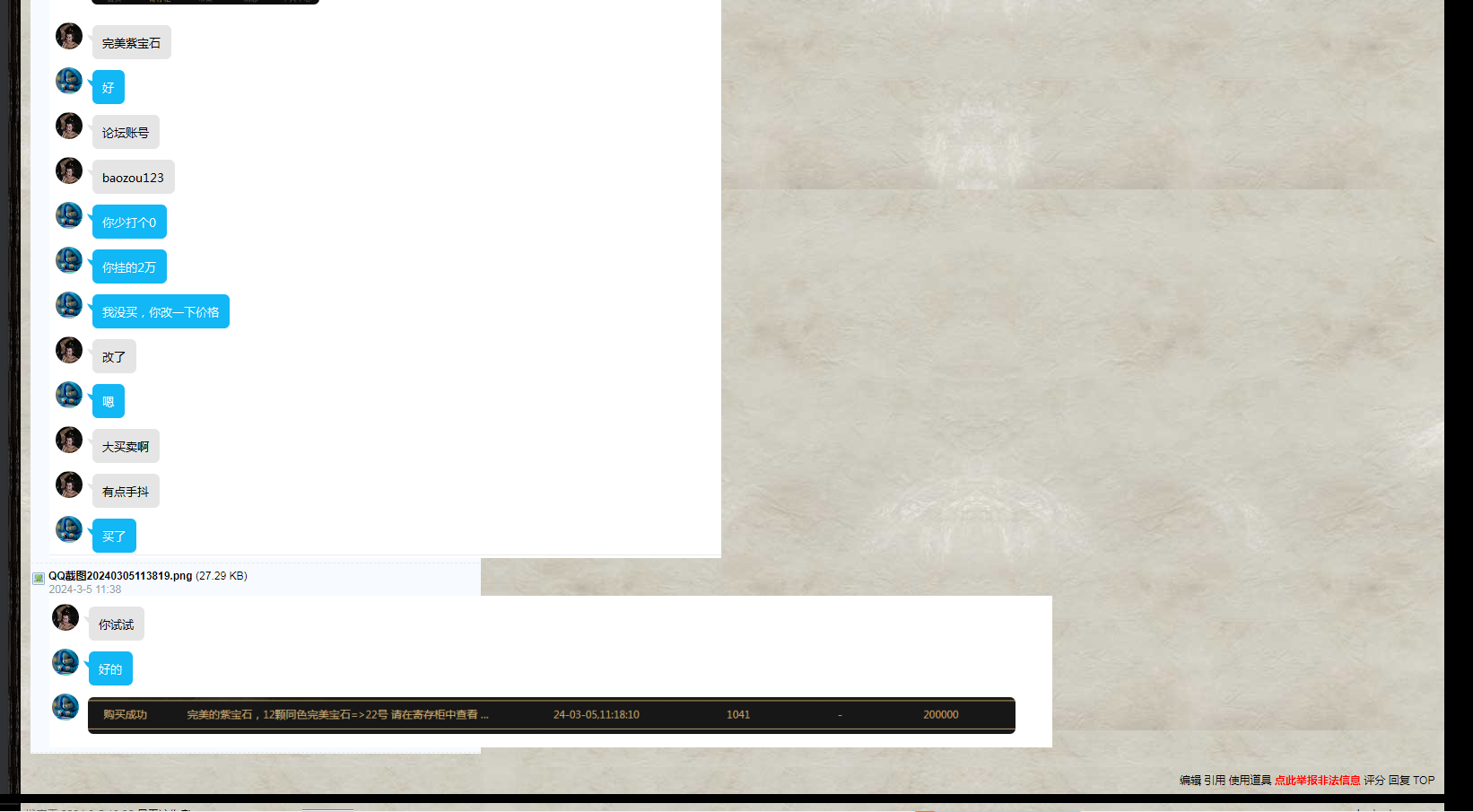 从我的zhouning444账号交易295900烧鸡到我baozou123账号,2024年3月5号,我用20万23拍卖行烧鸡换了1800骷髅,对方把账号baozou123交易给我,我在1573楼备案,今天玩25区因为需要游戏账号绑定论坛,为了将来方便。把2号的骷髅跟烧鸡交易到一起