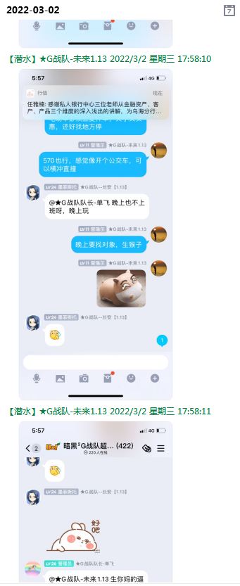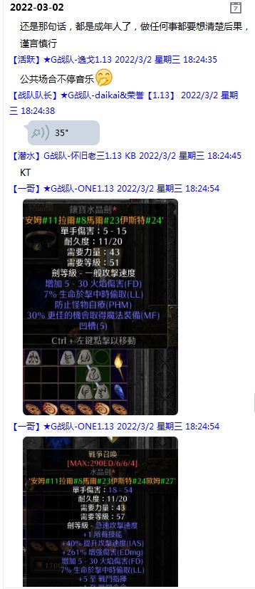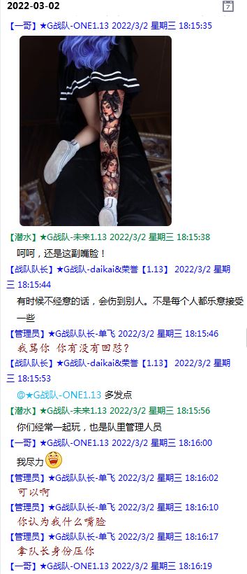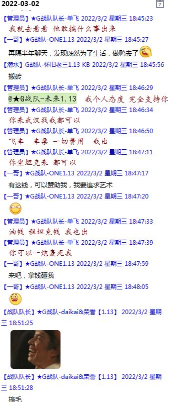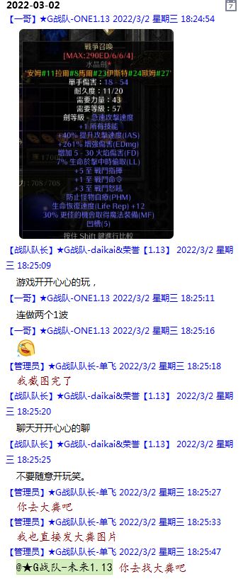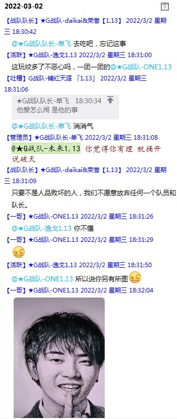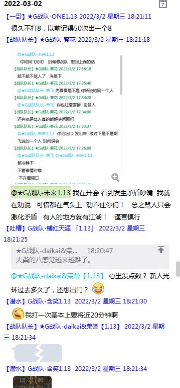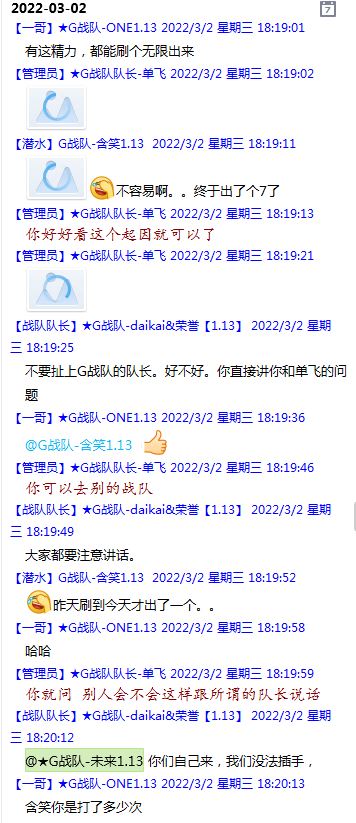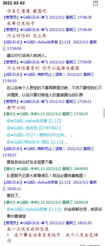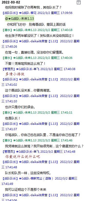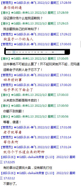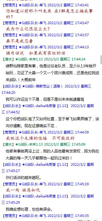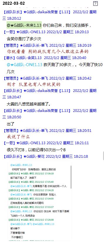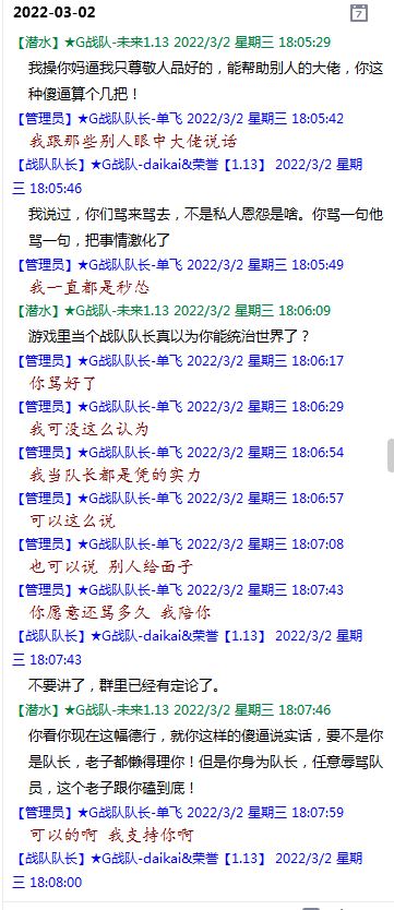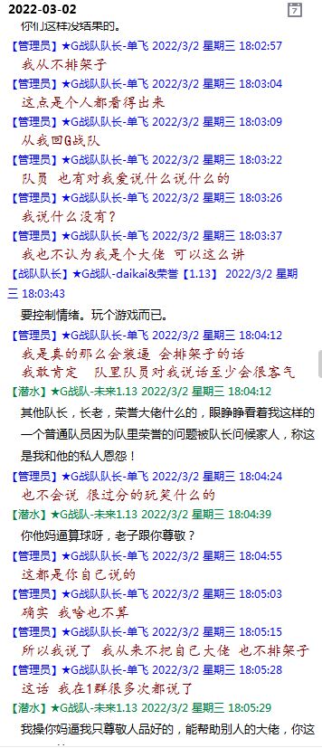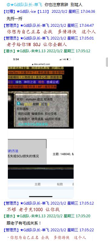 今天下午上班时,偶然看了眼手机,G战队群单飞@所有人发布了一条消息,大意就是他因为工作暂时离开群里,不再玩游戏,我看到群消息也凑了下热闹,调侃了一下单飞,队友挽留他忙工作可以晚上玩游戏,我说他忙着找对象,生猴子,这样的玩笑话是个人我想都知道是在开玩笑,结果引来单飞污言秽语,问候我家人的恶毒辱骂,并且持续到晚上6点半,一开始我还是蒙圈状态,开个玩笑不至于吧,我说话不好听,他开不起玩笑我挨骂是我活该,问候家人就不对了吧?开始我还是忍耐的,毕竟我错在先,先调侃了他。后来他污言秽语不断我才开始跟他对骂,也慢慢明白点他为什么要骂我:单飞说我曾经坑一个网名叫多情游侠的一个119ed,其他全满属性的卓古拉手套,还说我抱大腿,我都不知道我抱了哪位大佬的大腿了,绿野仙踪?跟我关系特别好的好像只有这一位,其他都是请教或者讨论问题,要么就是帮助我以后的新人。我也至今不明白他说的是什么时候到事情,到底是我弃游的这两年内发生的事,还是3,4年前?那会我进入G队了吗?在游戏里我一直用的都是G战队名字的人物,送新人装备,带新人PASS,KB升级,也做了不少贡献,也曾经因为信任大佬,对虚拟资产不是很在意,在请教大佬搭配人物装备后密码都不改,丢过身上最贵的装备气的差点弃游,我没捐过款,没交过队费,之前玩的时候我太穷,想要的装备都买不起,直到20年3月退游日子也过的紧巴巴的,但是从来没做过对不起队里的事情,也没有坑过新人。论坛里最初账号是qq12321,大概是19年3月份注册的账号,同年大概6月左右自己攒钱买了第一个无限以后重新注册了现在这个账号shmulm,并支持大粪充值100元,再无其他账号!单飞说我四年前坑的,四年前23018年我连粪网都不知道如何去坑?一年后的3月我才加入粪网,又不记得什么时候才加入G队,我如何在18年坑人?
